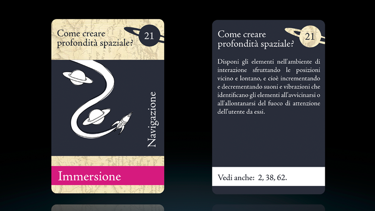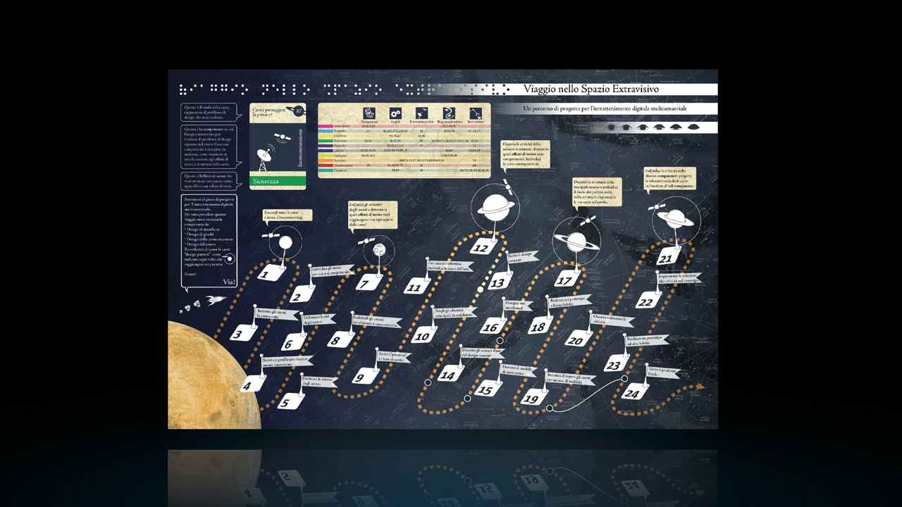 The poster is designed as a real board game for authors that want to make accessible games, guiding them through the design process. At different stages in the process they are asked to use the cards, at first as a brainstorming/inspirational tool and later to address specific issues, e.g. in-game space navigation or how to manage multiplayer.