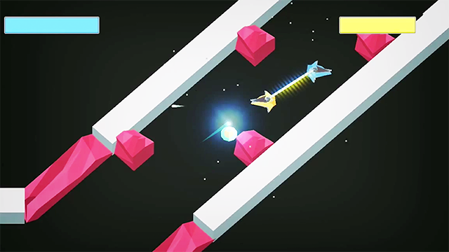 An experimental arcade game in which two players share a controller to guide two little ships connected by a rod.